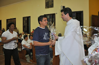 Como estava na programação da Festa, hoje falamos sobre o batismo e sua importância em nossas vidas. É o sacramento mais importante. Ele perdoa o pecado original e nos torna herdeiros do Reino de Deus. Precisamos pensar bem ao escolher os padrinhos de nossos filhos. Eles precisam ser pessoas que sirvam de exemplo para as crianças e os sigam por toda a vida, ajudando na educação cristã deles.